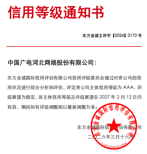 东方金诚国际信用评估有限公司正式发布信用评级报告,评定中国广电河北网络股份有限公司主体信用等级为AAA,评级展望为稳定。AAA级作为国内企业主体信用评级的最高等级,此次获评是权威机构对公司偿债能力、经营实力、抗风险水平及发展潜力的全面认可,标志着公司信用修复取得决定性进展。